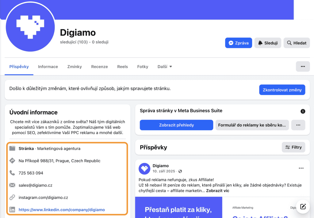 Zde doporučujeme vyplnit vše, co systém nabízí – webová stránka, kontakty, otevírací doba, úvodní informace, fotka. Postupně se vám zeď profilu bude plnit zveřejněnými příspěvky a zákazníci budou moci udělit stránce hodnocení na základě zkušeností s firmou.