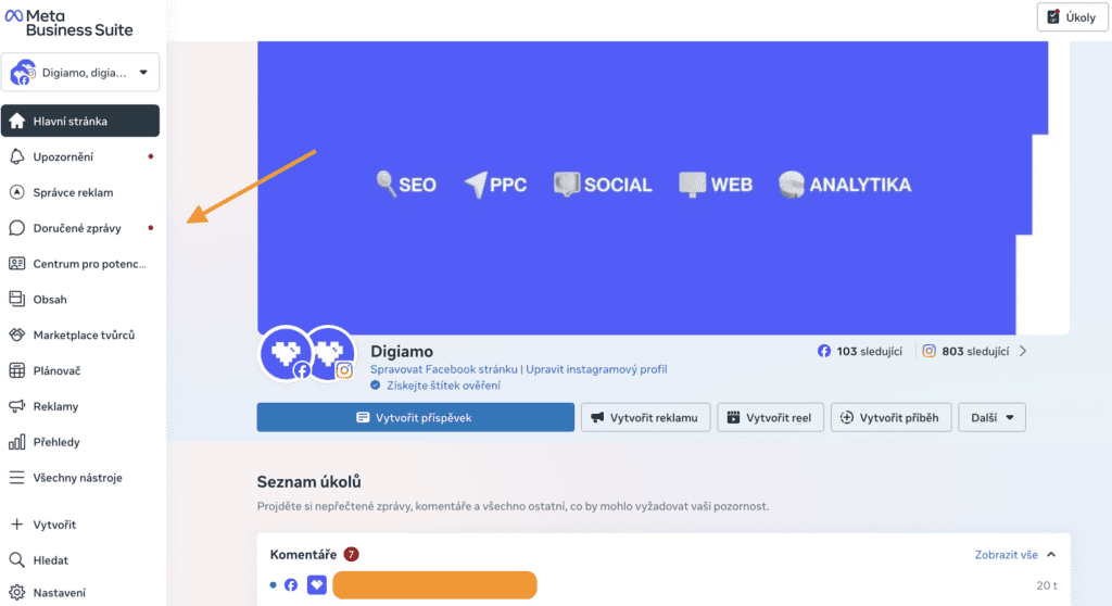 Pokud chceme založit klasický osobní profil, míříme klasicky na hlavní stránku Facebooku. Pokud ale máme v plánu PPC marketing, je potřeba registraci provést přes prostředí Meta Business Suite. Vaším prvním krokem tedy bude navštívit tuto stránku. K založení firemního účtu je potřeba, abyste měli k dispozici váš osobní účet na Facebooku (nikdo jiný než vy neuvidí, že spravujete tento firemní profil). V menu po založení můžete vidět všechny funkce, které Business Suite nabízí od doručených zpráv po plánování obsahu.