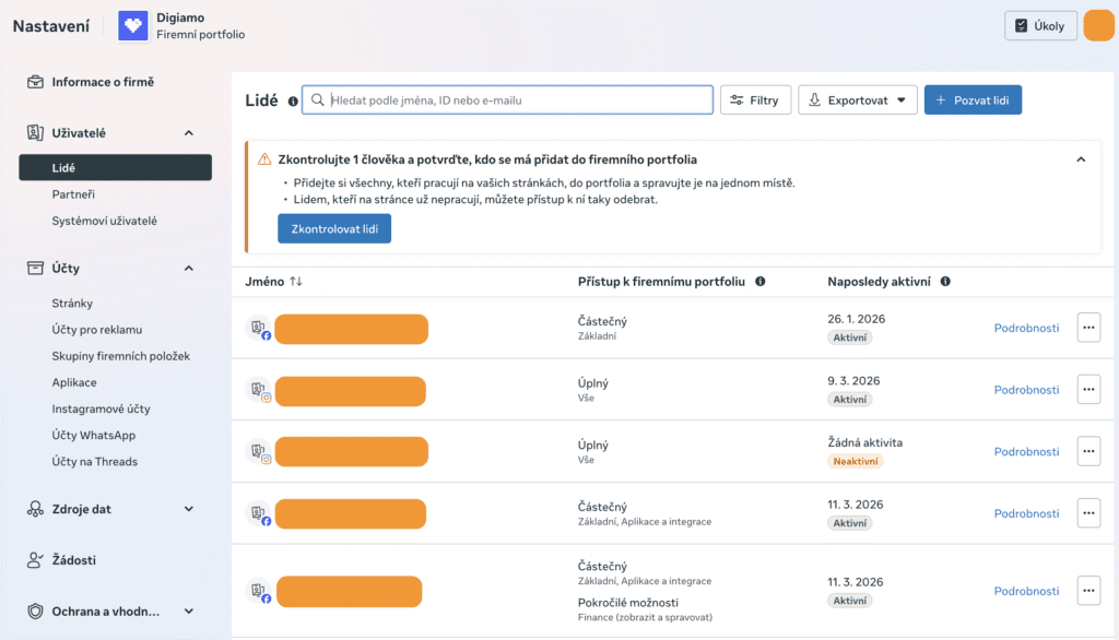 Pod sekcí “Nastavení” lze upravit přístupová práva uživatelů. Zde je možné ovlivnit, komu a jak velký přístup poskytnete v rámci firemního profilu, reklamního účtu a stránky.