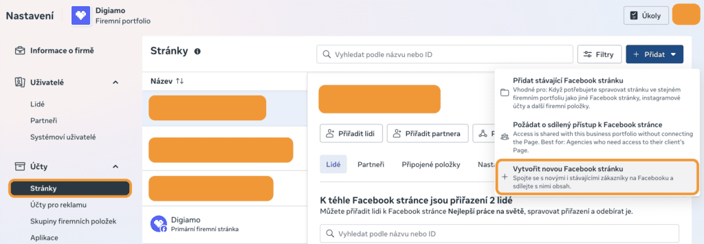 Následuje vytvoření firemní stránky. Tu založíte opět v nastavení, v sekci “Stránky”.