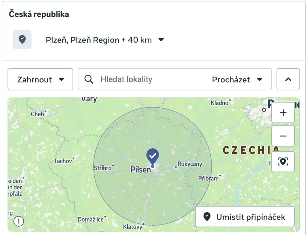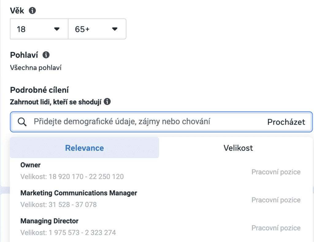 Při nastavování kampaně a jednotlivých sestav myslete na to, jaké publikum chcete oslovit. Pokud máte pouze lokální prodejnu v Plzni, rádi byste se připomněli pravděpodobně lidem, kteří žijí v okolí města. Zároveň pokud víte jejich charakteristiku – například je to prodejna potřeb pro psy, budete hledat zájmy jako ” psi” nebo “dog lovers”. Tím specifikujete okruh uživatelů, na který se Meta zaměří.