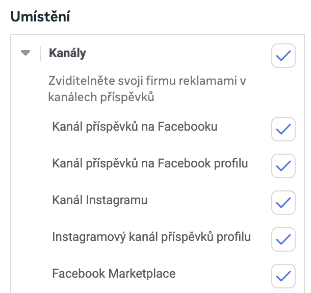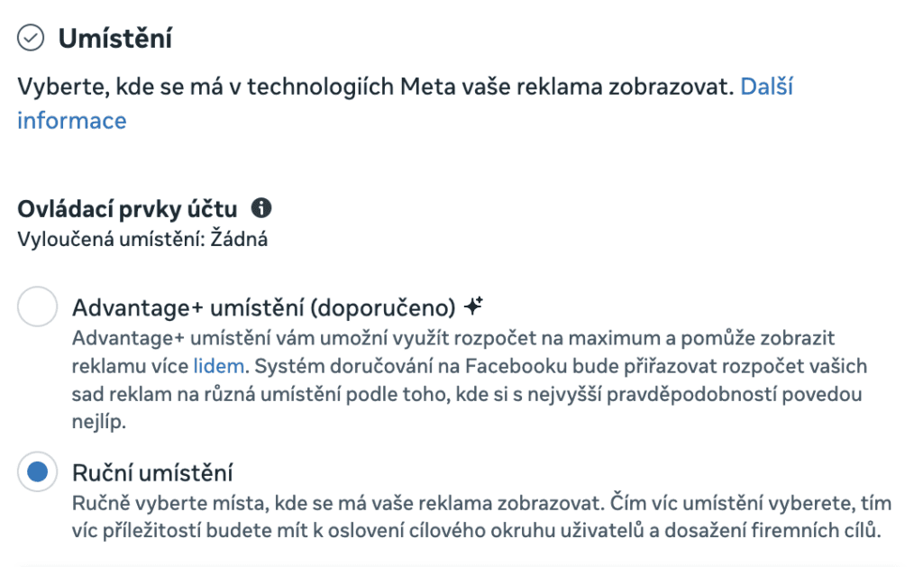 V sestavě je možné upravit, kde se reklama bude zobrazovat. Pokud zakliknete “Ruční umístění” máte možnost omezit, kde se reklama bude (například na základě výsledků minulých kampaní) zobrazovat. Ať už na základě platformy (Facebook, Instagram, WhatsApp…) nebo zařízení (PC, tablety…). Ještě specifičtější nastavení najdete v sekci Umístění, kde specifikujete konkrétní místa zobrazení reklamy. Například si tak můžete zakázat zobrazení na Marketplace nebo ve výsledcích vyhledávání.