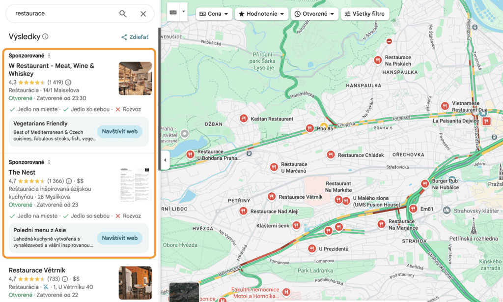 Jestliže jste například restaurace v určité lokalitě města, kde chcete oslovit uživatele v okolí, jsou Google mapy jednou z možností jak na sebe upozornit. V levém sloupci se váš podnik vyhoupne na přední pozice a máte tak větší šanci, že nalákáte nové zákazníky, kteří zrovna aktivně vyhledávají vaše služby. Samozřejmě tak, jako ve vyhledávací kampani, platí hodnocení Googlu na základě relevance k dotazu od uživatele.
