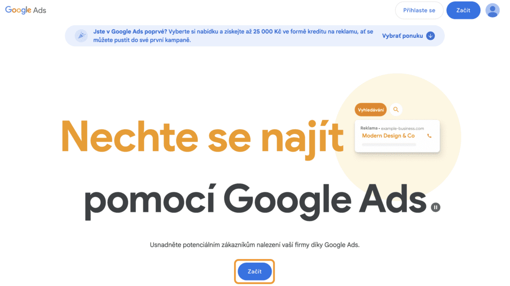 Pokud již máte svůj účet Google Ads, přihlášení by nemělo být problém. Pokud účet zakádáte, na hlavní straně Google Ads kliknete na tlačítko “Začít” kdy vás systém rovnou hodí do sekce zakládání účtu.
