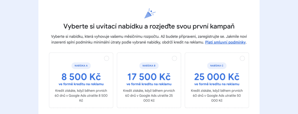Než tak ale provedete sjeďte na stránce o něco níže, kde si doporučujeme projít nabídku, kterou Google Ads aktuálně nabízí a zvážit, zda bonus nevyužijete. Pro začínající firmy je to výborný start, jak si systém oťukat a ušetřit přitom peníze.