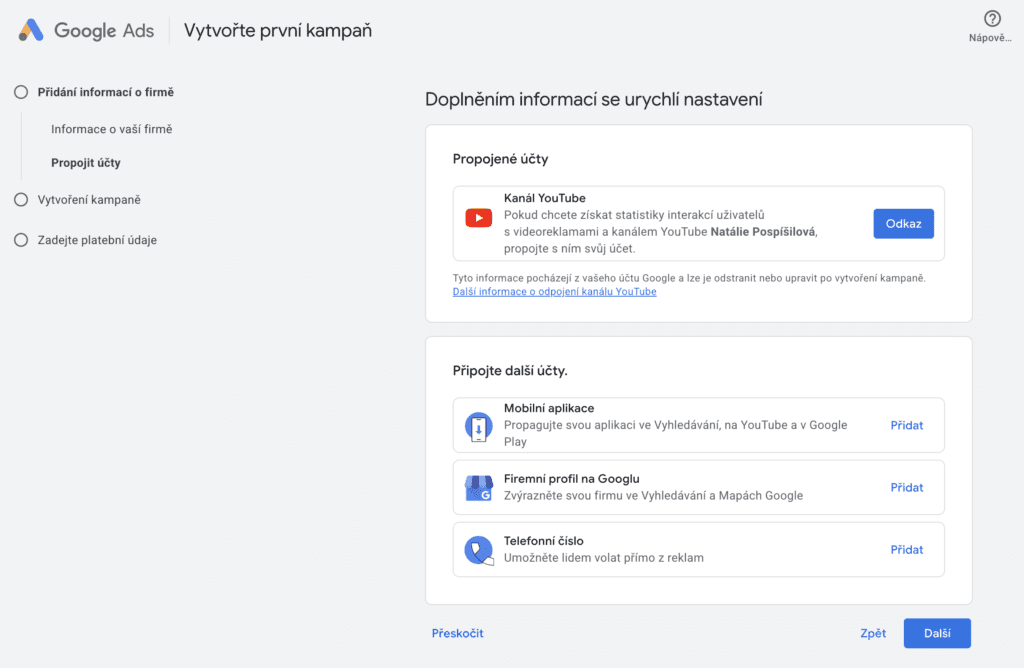 Následně máte možnost propojit ostatní účty s Google Ads. Tento krok je možné provést později, nicméně pokud chcete například propagaci na YouTube, je propojení nutné. Googlu (a jeho algoritmu) tak zároveň poskytnete ucelenější informace o vaší značce.