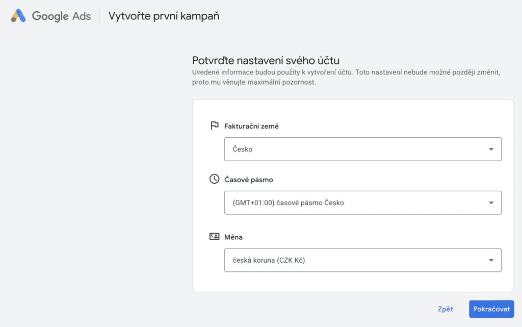 Vytváření první kampaně můžeme prozatím přeskočit a dostáváme se k platebním údajům. Po vyplnění odesíláte finální formulář a dostáváte se do systému Google Ads.