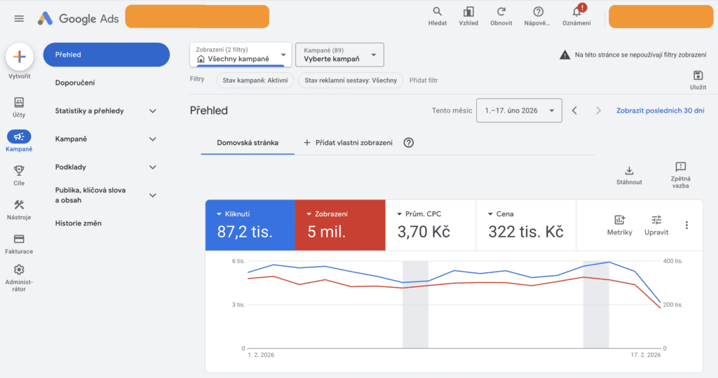 Nyní se ocitáte na hlavní stránce Google Ads, která nebude mít aktuálně k dispozici žádné statistiky jako názorný účet níže. První kampaň teprve čeká na založení, ale grafy se začnou rychle plnit zajímavými čísly.