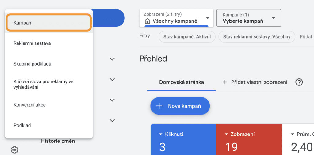 Pobídka pro vytvoření kampaně na vás bude čekat hned na několika místech, ať už kliknete na modré plus v levém sloupci a nebo se prokliknete přímo přes tlačítko “Nová kampaň”. Na ukázku si vytvoříme vyhledávací kampaň