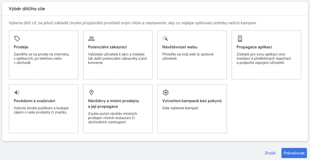 Jednoduchá a přednastavené sekce vám ulehčí práci, pokud jste začátečník. Nicméně je důležité zmínit, že cesta ke správné strategii mnohdy není tak jasná, jak zde Google Ads nabízí. Pokud zvolíte “Kampaně bez pokynů”, budete si moci vše nastavit dle svého uvážení.