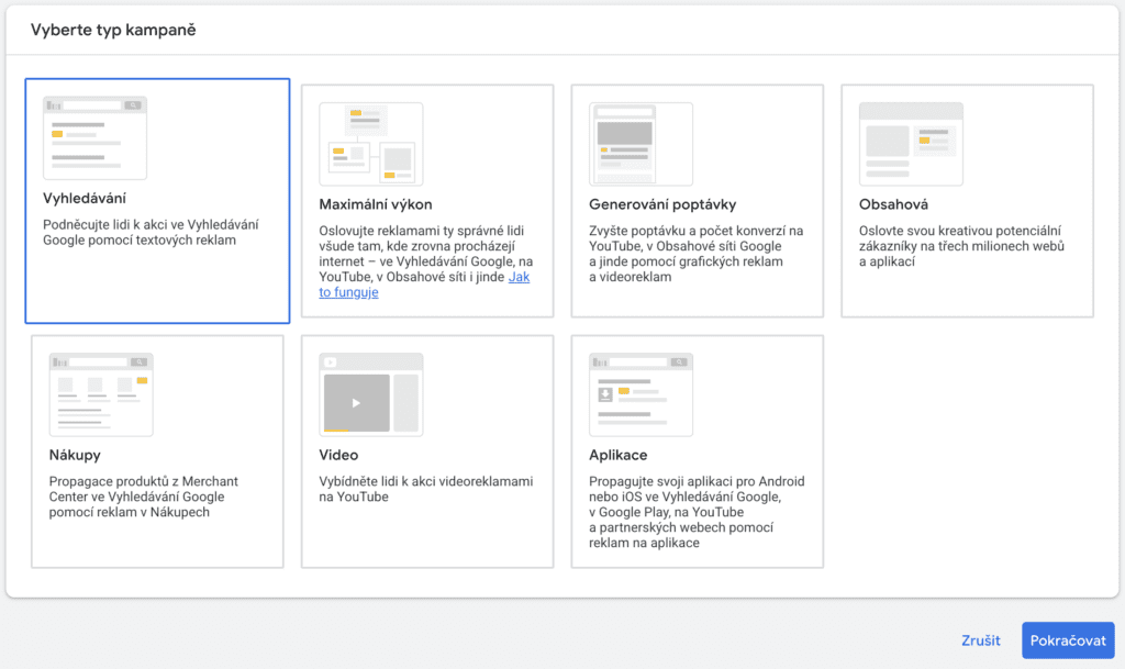 Po kliknutí na zmíněné nastavení kampaně zadáte typ, kterým je vyhledávání. Jak můžete vidět, je zde maximální výkon (Performance Max), obsahová (bannerová) kampaň, produktová kampaň i propagace aplikací. Později se k nim můžete vrátit a zhodnotit, zda stojí za otestování.