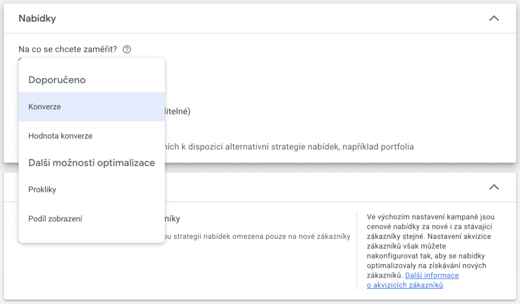 Následuje nastavení nabídky, neboli na co se chcete v rámci celé kampaně zaměřit.