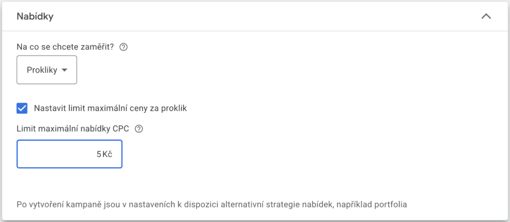 Pro tuto kampaň zvolím nabídku na základě prokliků a v mém případě dávám limit pro maximální cenu za proklik 5 Kč.