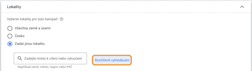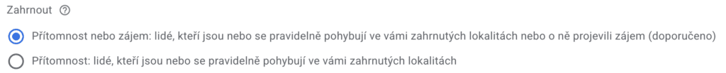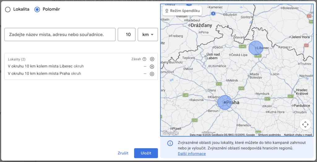 Na základě lokality nebo rádiusu můžete zadat konkrétní místo, na které máte v plánu cílit. Na příkladu je uvedená jak Praha, tak Liberec, tudíž kampaň bude cílit na obě místa zároveň v okruhu 10 km.