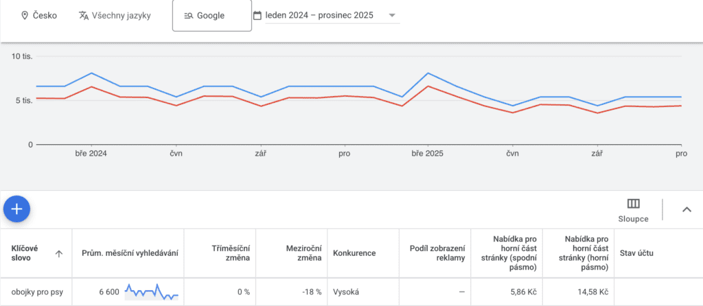 Na příkladu “obojky pro psy” můžeme vidět vysoký počet vyhledávání, ale také vysokou konkurenci. Ta naznačuje, že se o první místa bude prát spousta jiných inzerentů a tím pádem stoupá také nabídka. V tomto případě bychom za první pozice zaplatili cca 15 Kč.