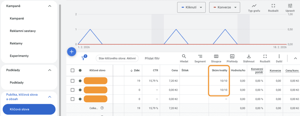 Skóre si u jednotlivých klíčových slov můžete zkontrolovat v sekci Publika, klíčová slova a obsah. V levém sloupci vidíte klíčové slovo na které se reklama zobrazila a ve sloupci skóre pak číslo, které vám Google Ads udělil. U každého výrazu může být číslo jiné. Toto je právě jeden z důvodu, proč se v každé sestavě snažíme cílit na podobnou skupinu klíčových slov – aby reklama korespondovala s každým výrazem.