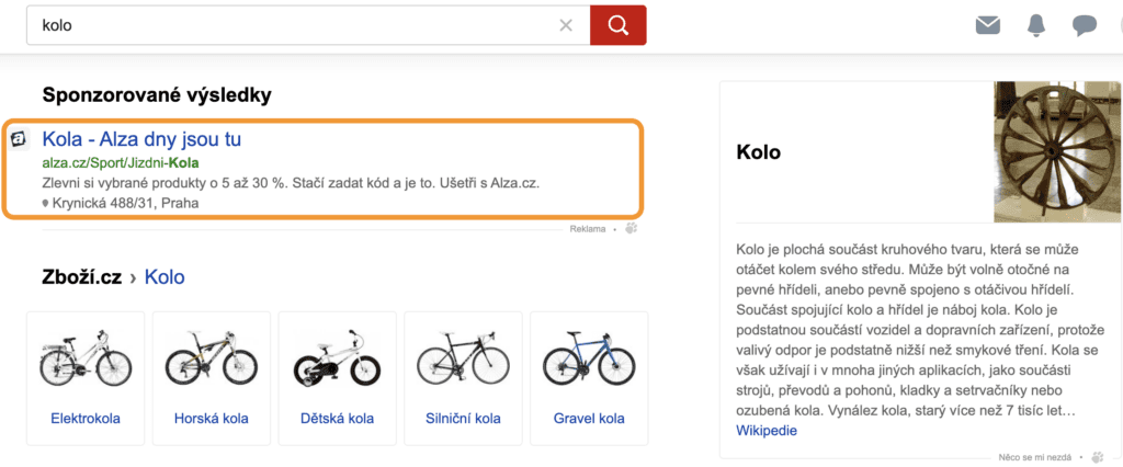 Reklama ve vyhledávání, která se zobrazí jakmile uživatel zadá klíčové slovo do vyhledávače Seznam.
