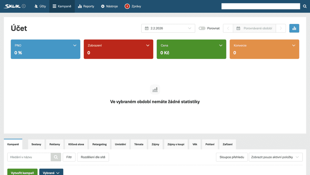 V rámci horního menu zde najdete jednotlivé účty (v případě, že pod e-mailem máte více propagovaných projektů), kampaně, (kde se odehrává veškeré nastavení), možnost exportu reportů, nástroje neboli nastavení (fakturace, měření konverzí aj.) a poté zprávy, které většinou obsahují systémové doporučení a hlášky od Skliku.